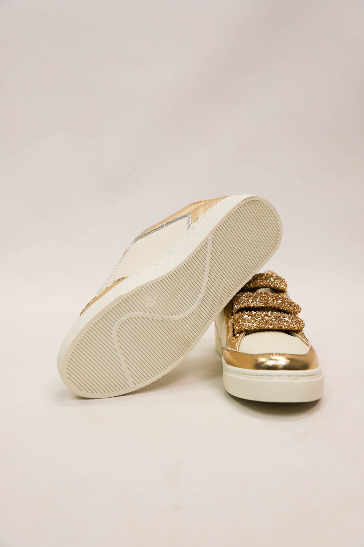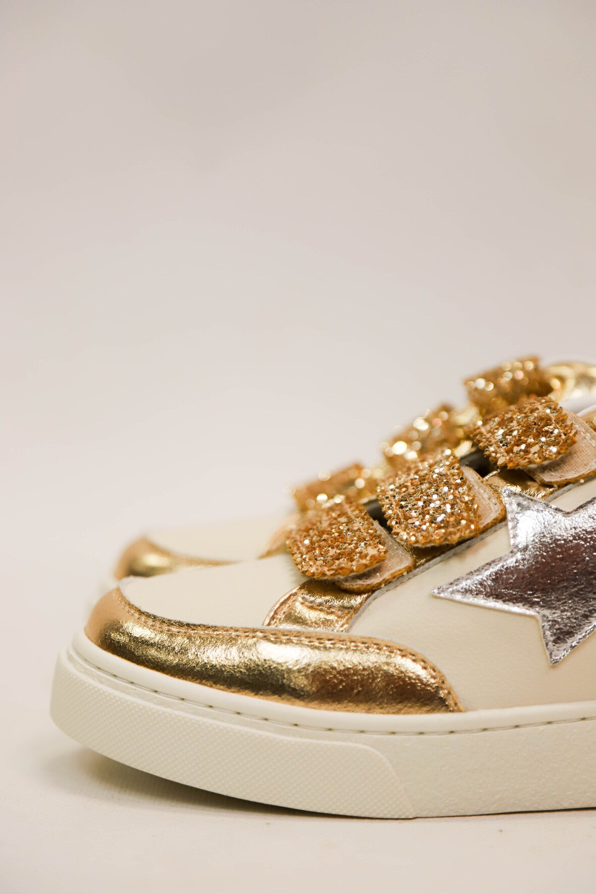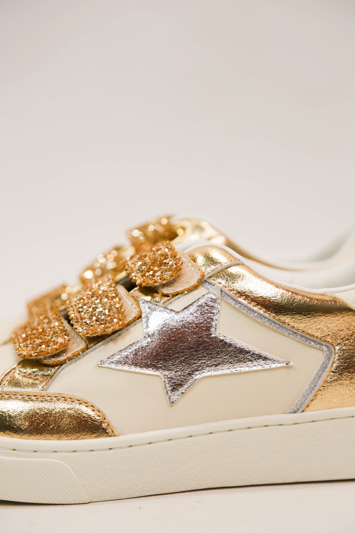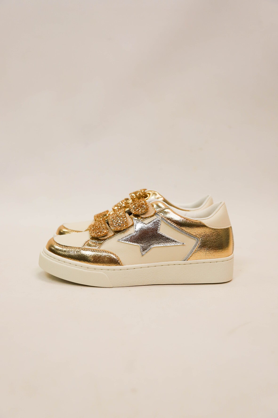 Baskets avec fermeture trois scratchs dorés pailletés. Etoile argentée irisée sur le côté extérieur