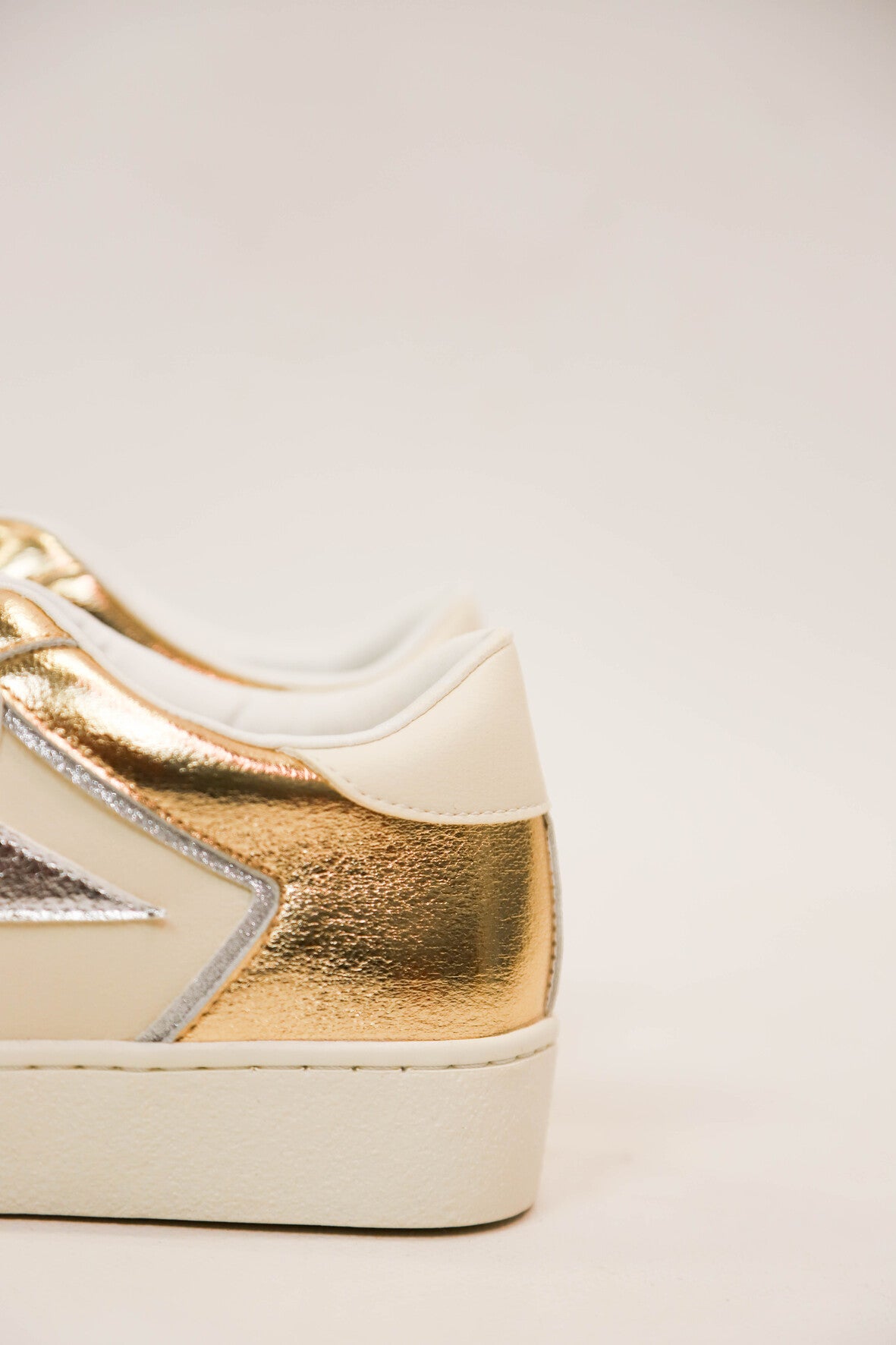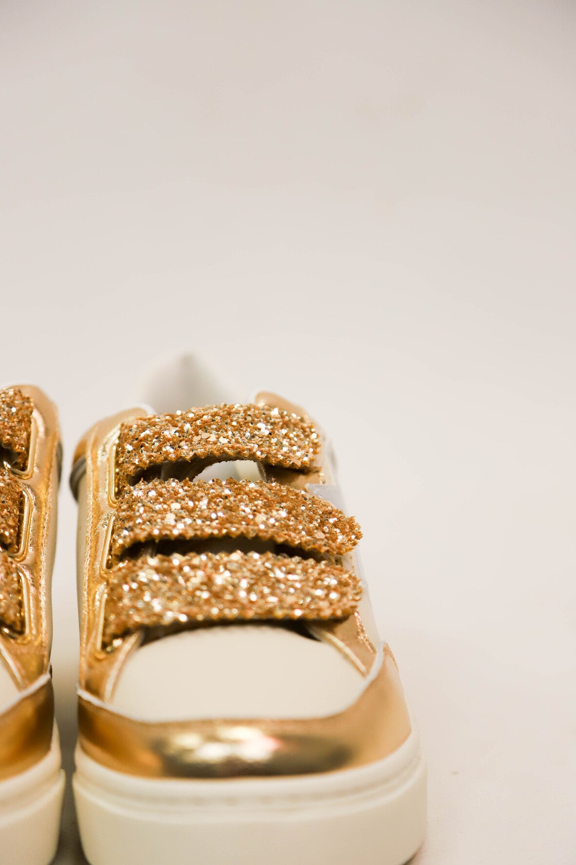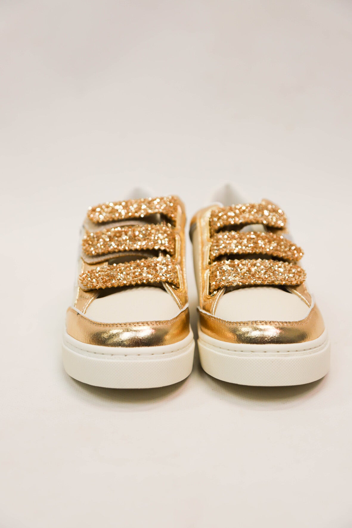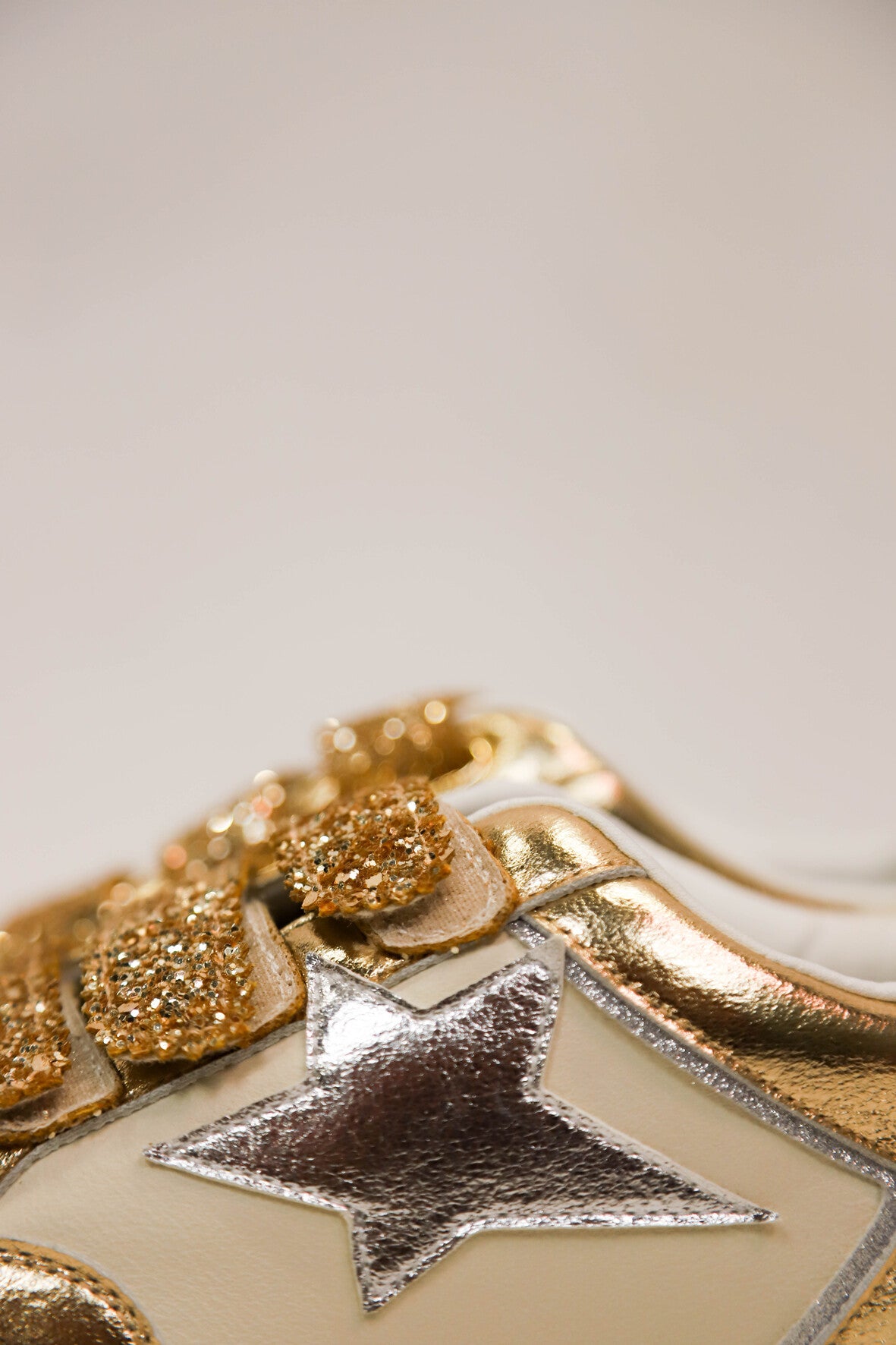 Baskets avec fermeture trois scratchs dorés pailletés. Etoile argentée irisée sur le côté extérieur