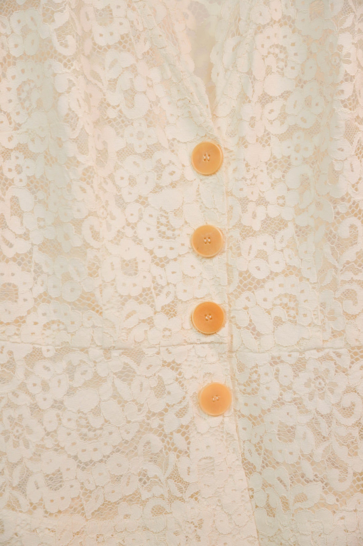 Blouse transparente en dentelle. Manches longues avec épaulettes. Cintrée à la taille