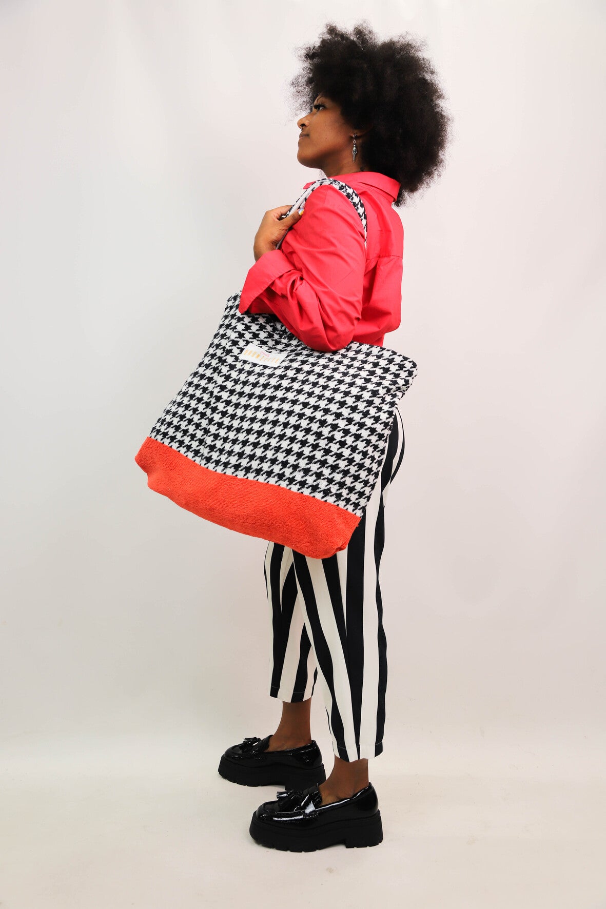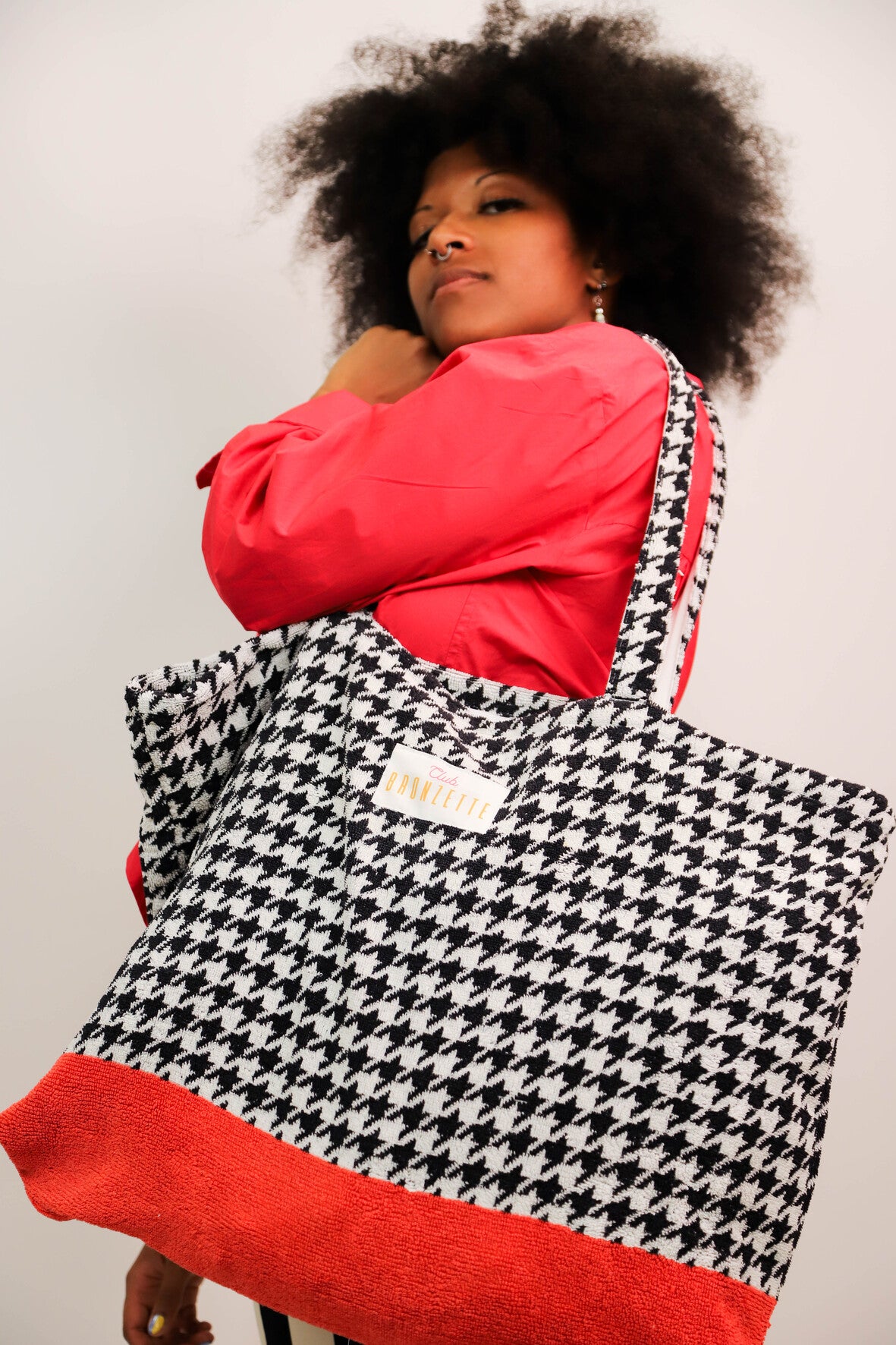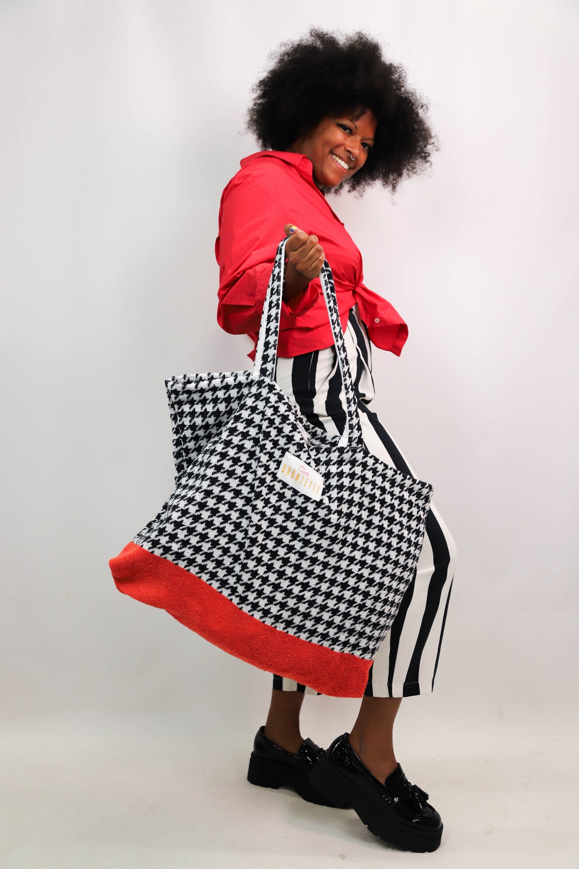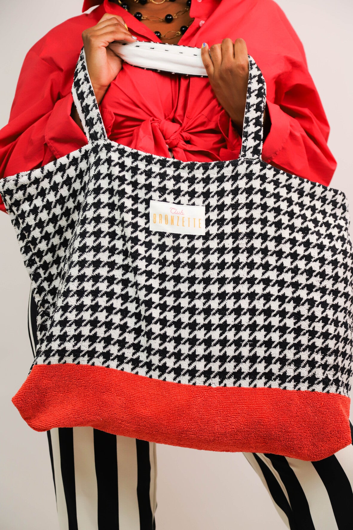 DESCRIPTIF | Cabas en éponge motif pied de poule noir et blanc et bande rouge |