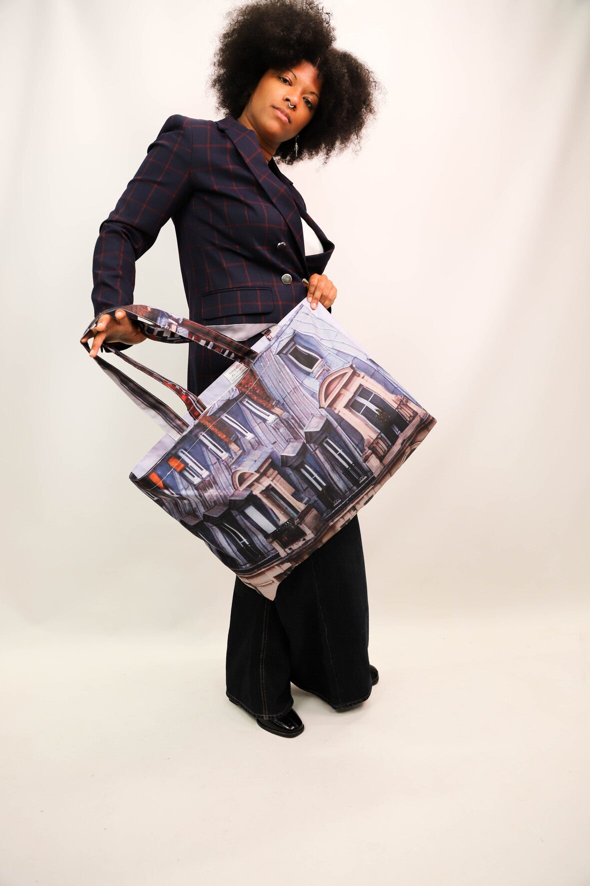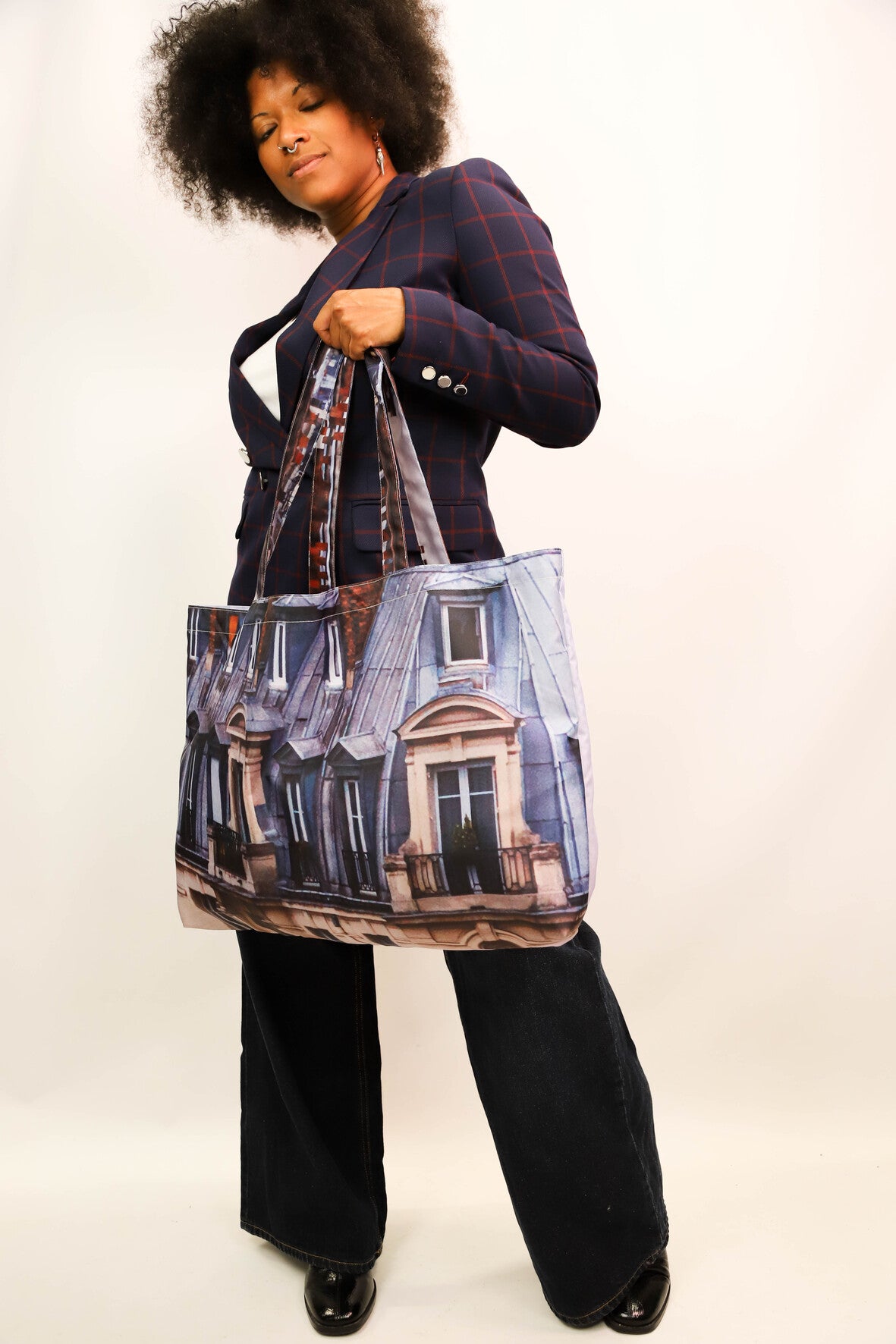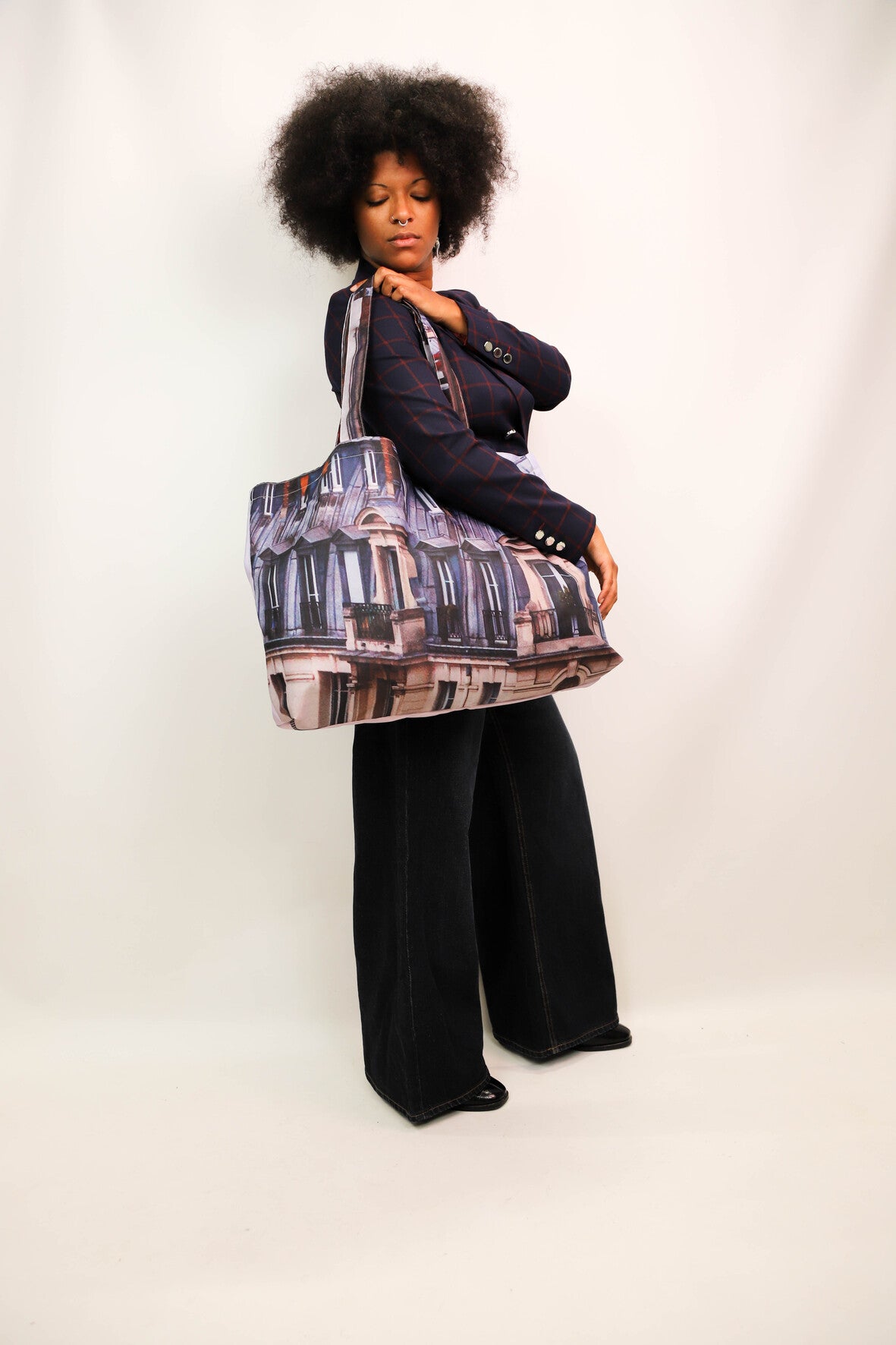 DESCRIPTIF | Cabas avec immeuble d'un côté et mauve de l'autre |