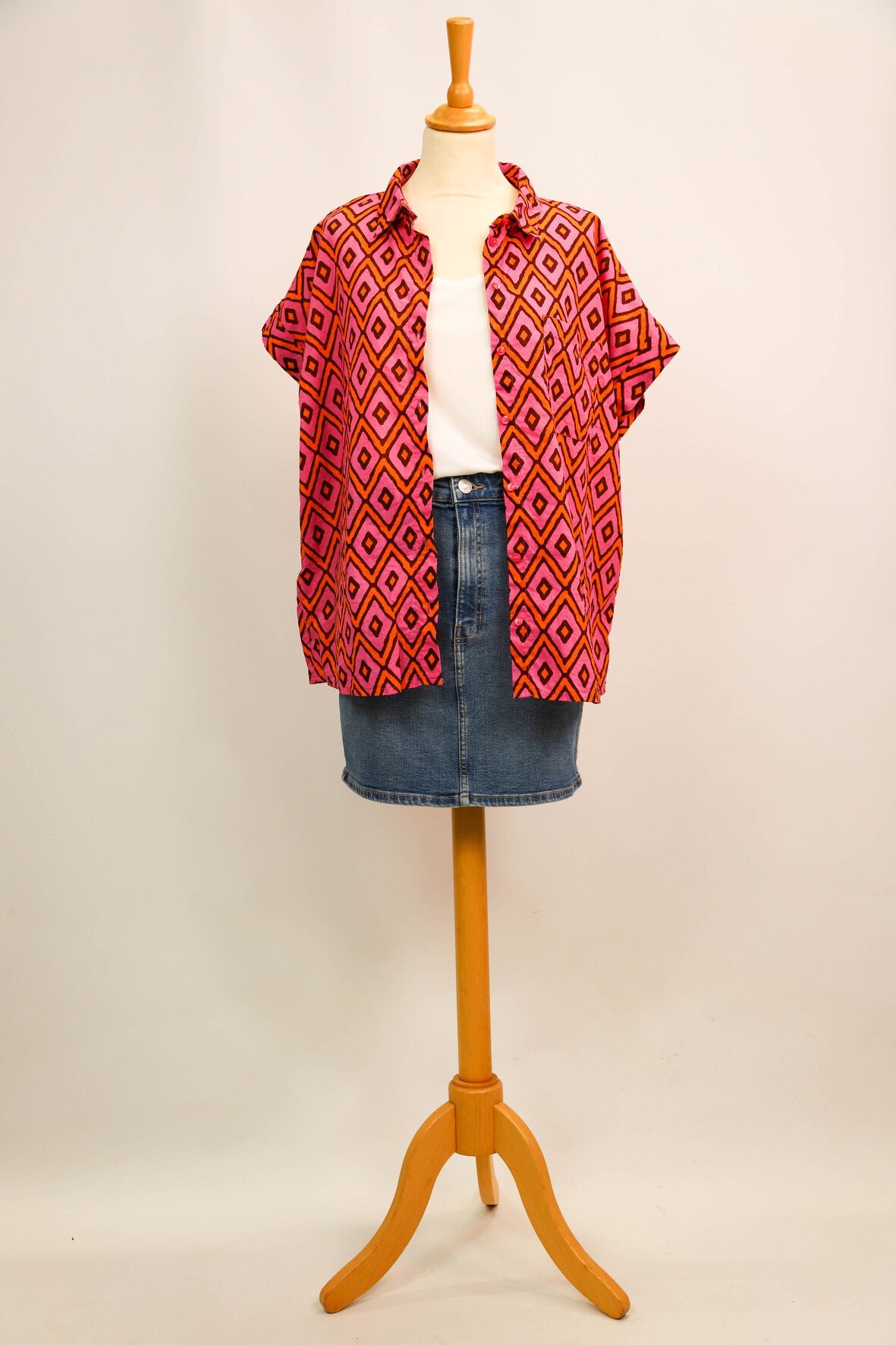 Chemise manches courtes. Motif losanges oranges sur fond rose. Poche sur la poitrine