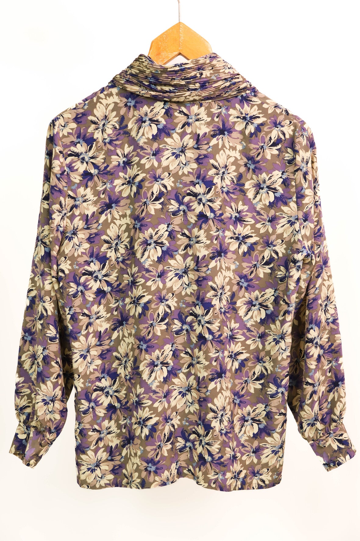 | DESCRIPTIF | Chemisier fleuri mauve, écrue et bleu. Col plissé |