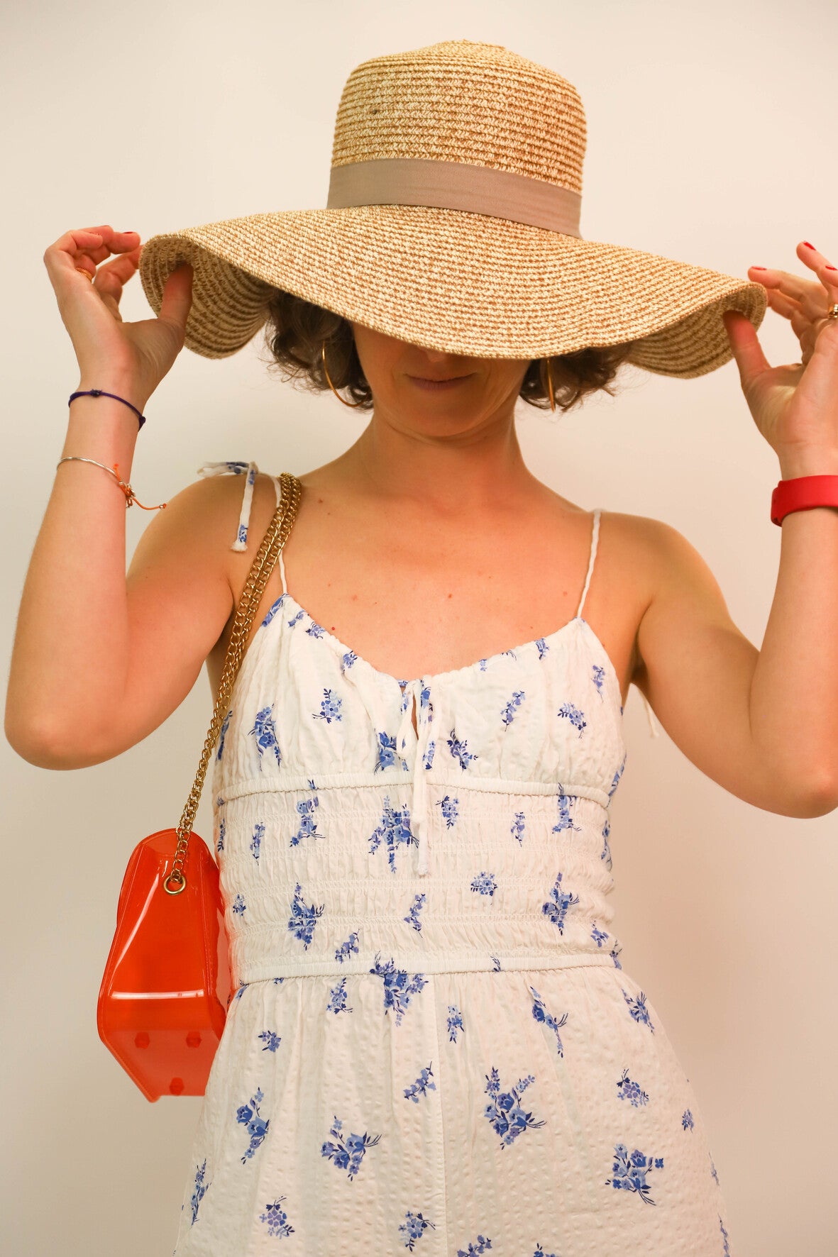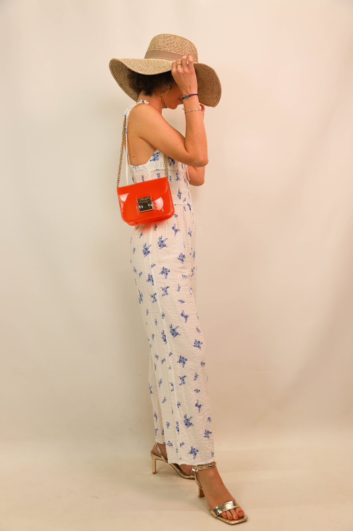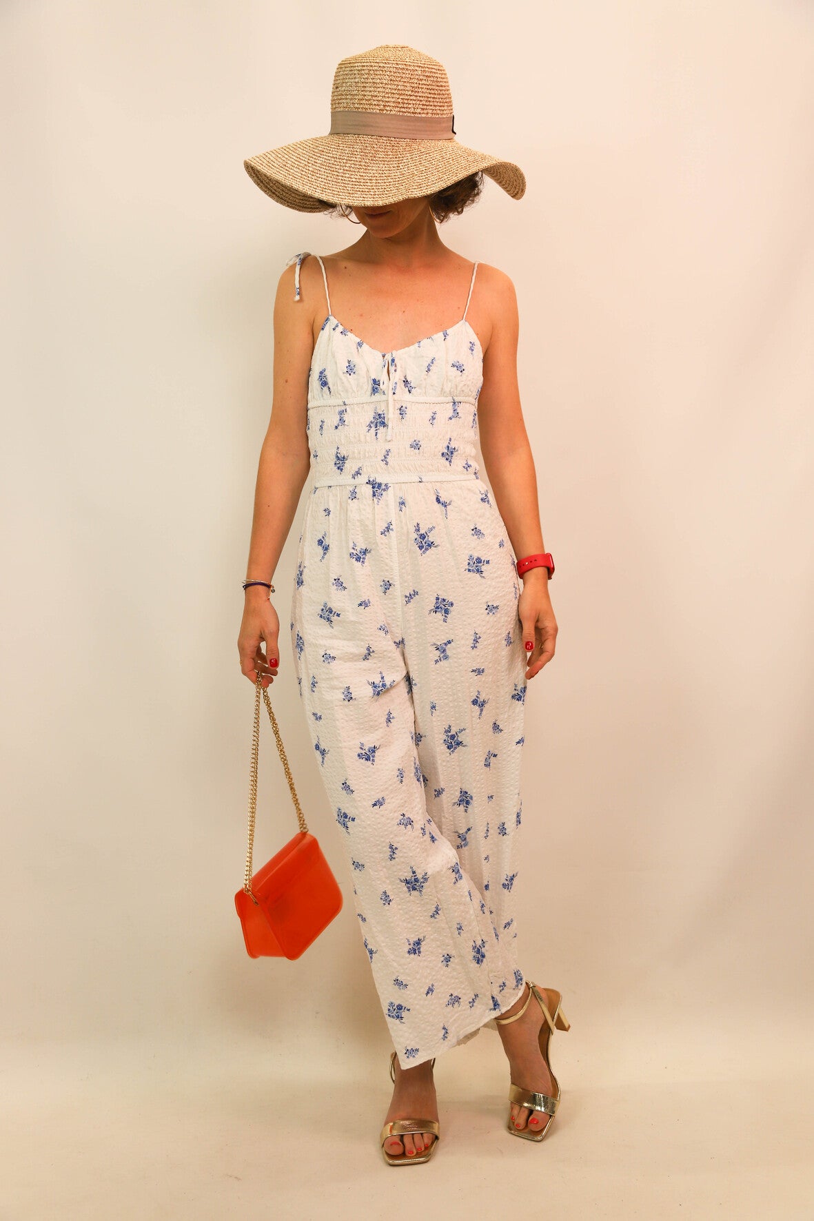 DESCRIPTIF | Combinaison pantalon effet gaufré, bretelles à nouer. Motif fleurs bleues |
