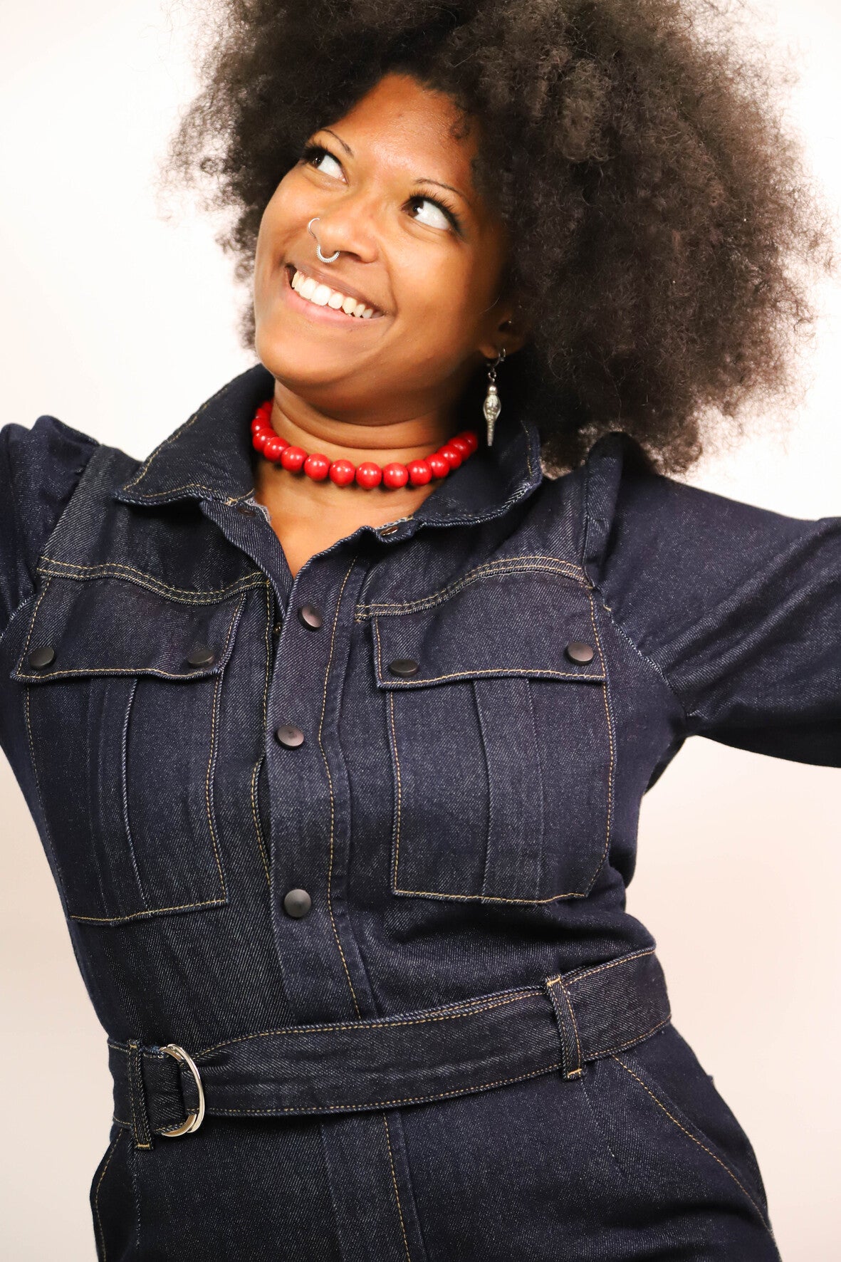 | DESCRIPTIF | Combinaison en jean. Ceinture à nouer, fermeture par boutons pressions. Poches plaquées sur la poitrine |