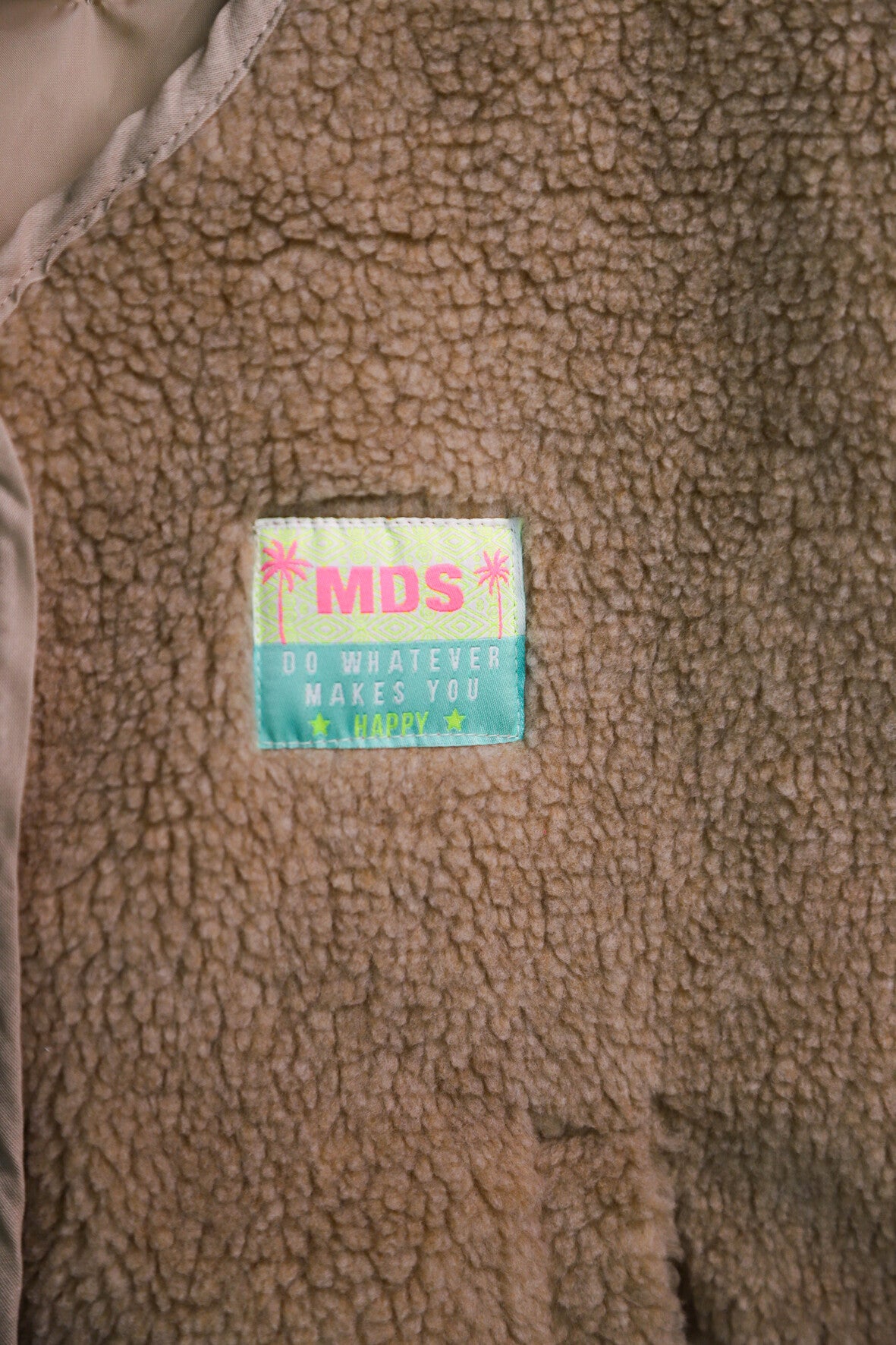 Gilet sans manches, fermeture par boutons pressions. Ecusson cousu sur la poitrine côté gauche. Extérieur effet polaire. Deux poches latérales.