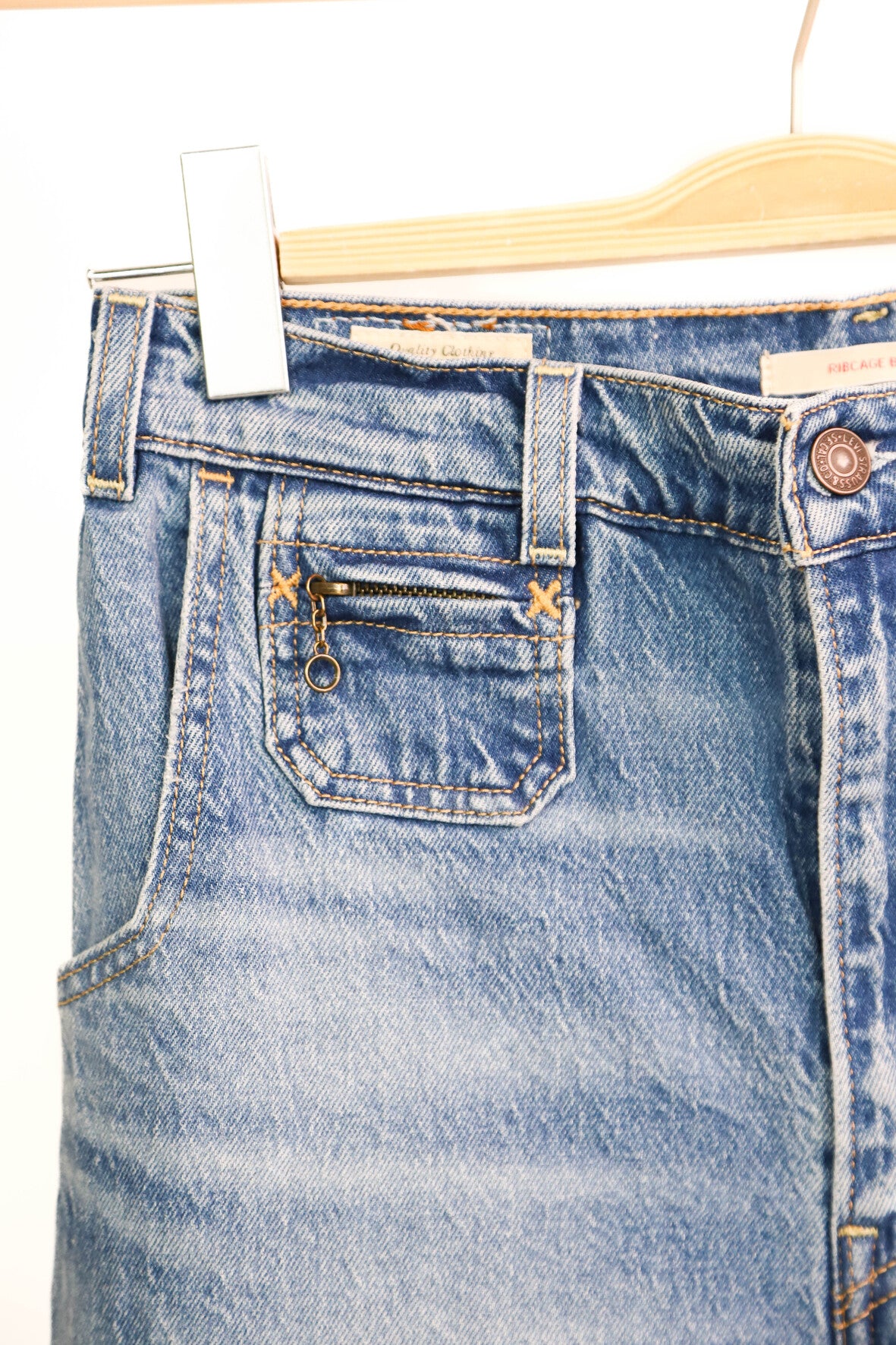 Jean taille haute, jambes larges. Coupe Ribcage bell. Poches latérales à l'avant et plaquées à l'arrière avec zip