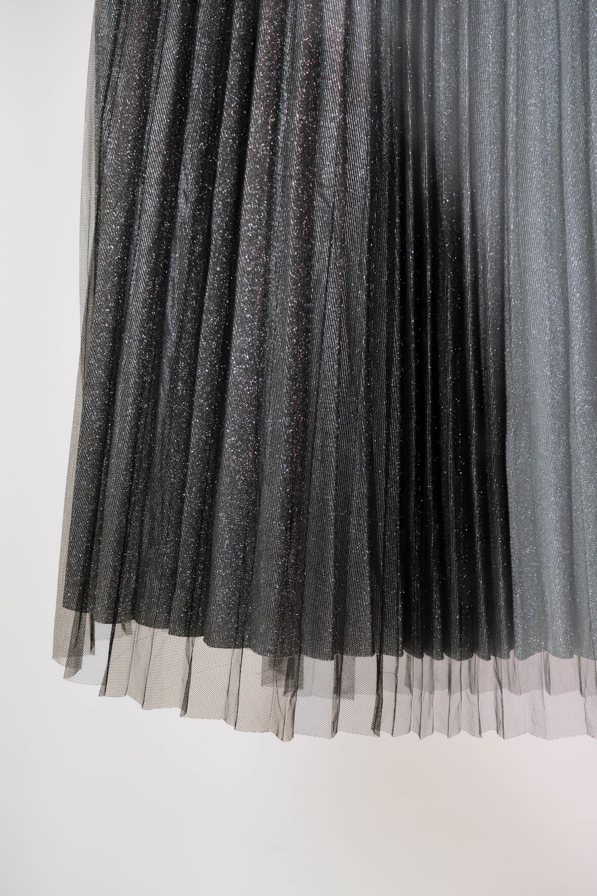 Jupe longue doublée plissée argentée pailletée. Tulle noir au dessus. Taille élastique