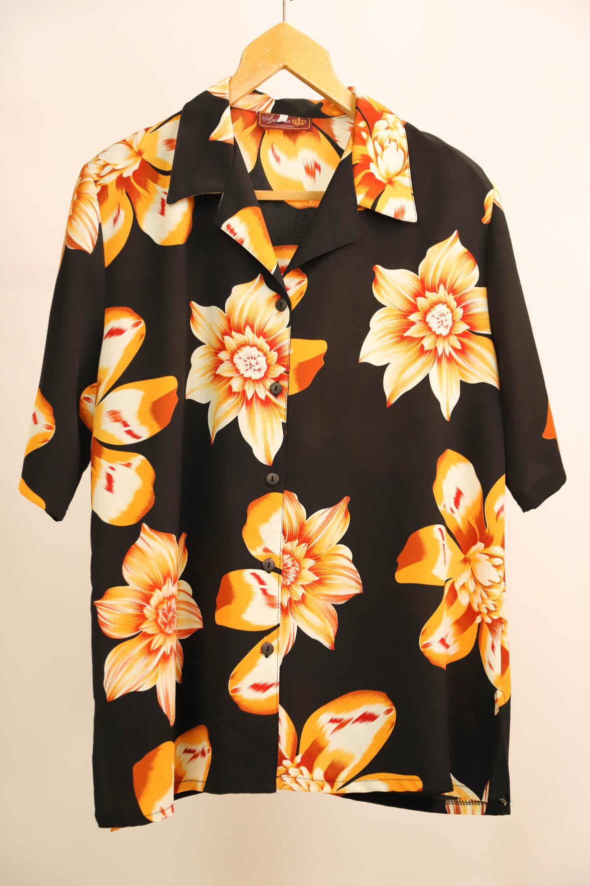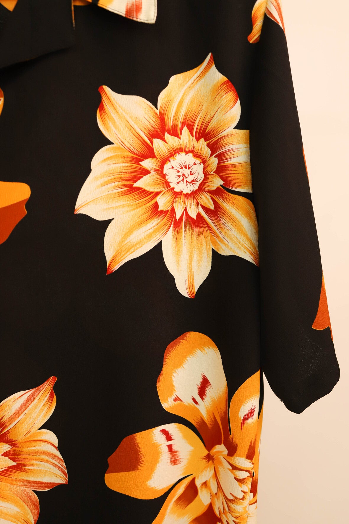 DESCRIPTIF | Chemisette souple et légère avec épaulette. Motifs fleurs orange sur fond noir |