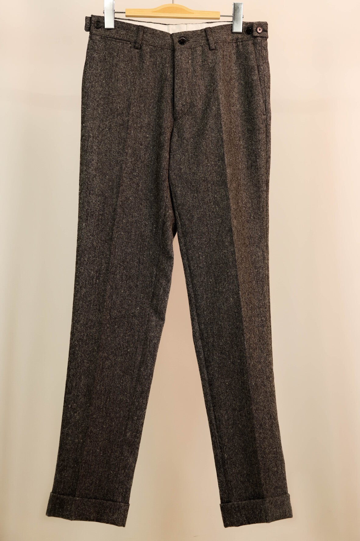 DESCRIPTIF | Pantalon en laine chiné avec poches latérales et passant pour ceinture |