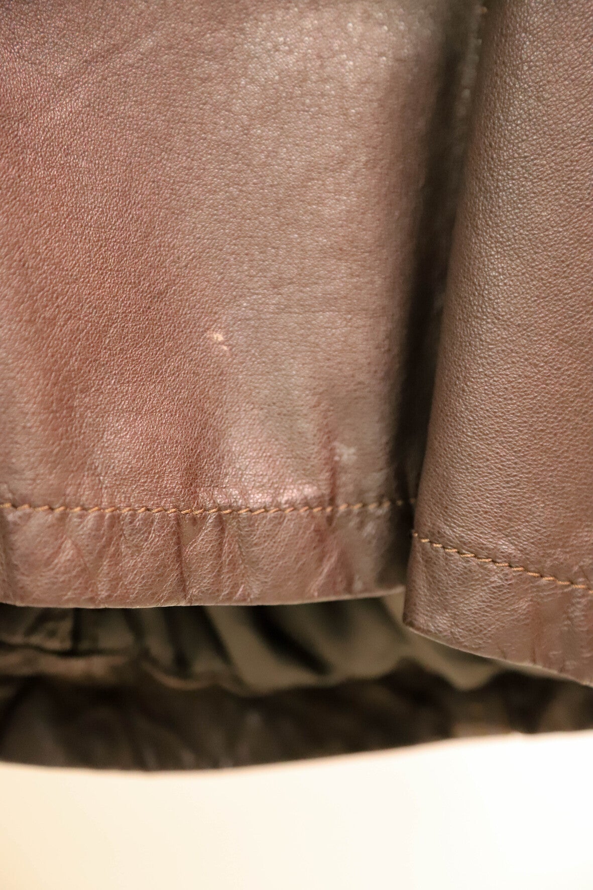 Blouson en cuir avec doublure col amovible. Fermeture zip et boutons. Quatre poches extérieures et trois poches intérieures
