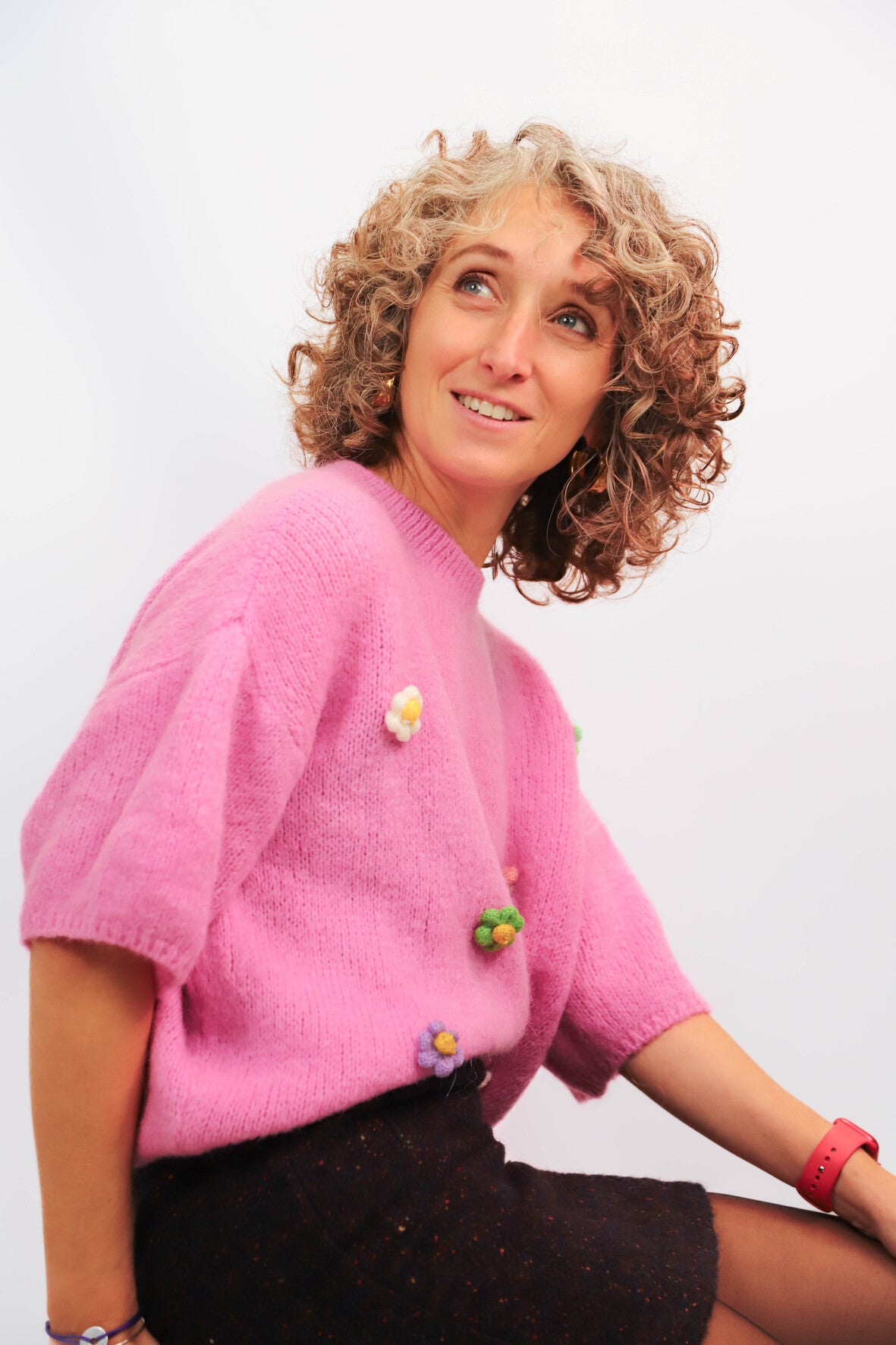| DESCRIPTIF | Pull manches courtes avec fleurs brodés en relief |