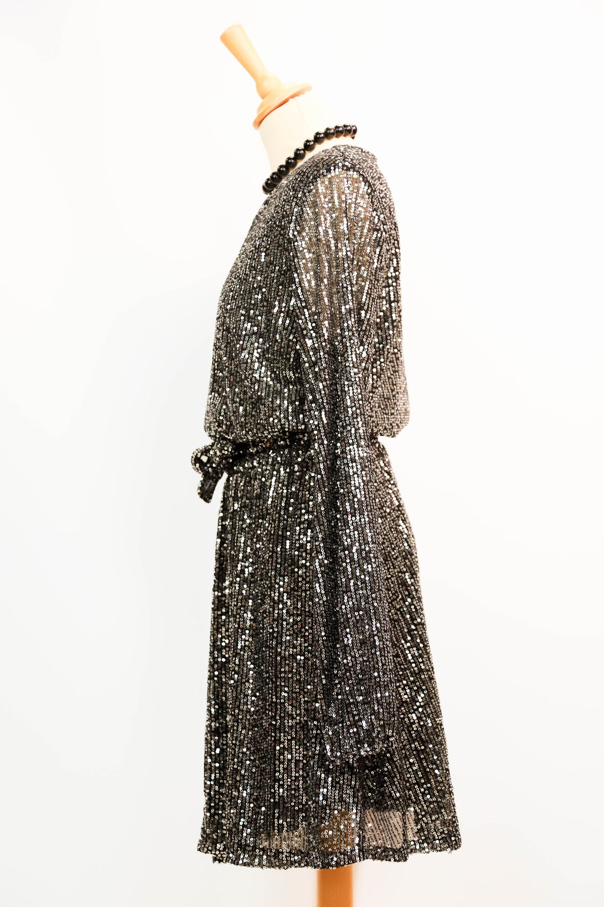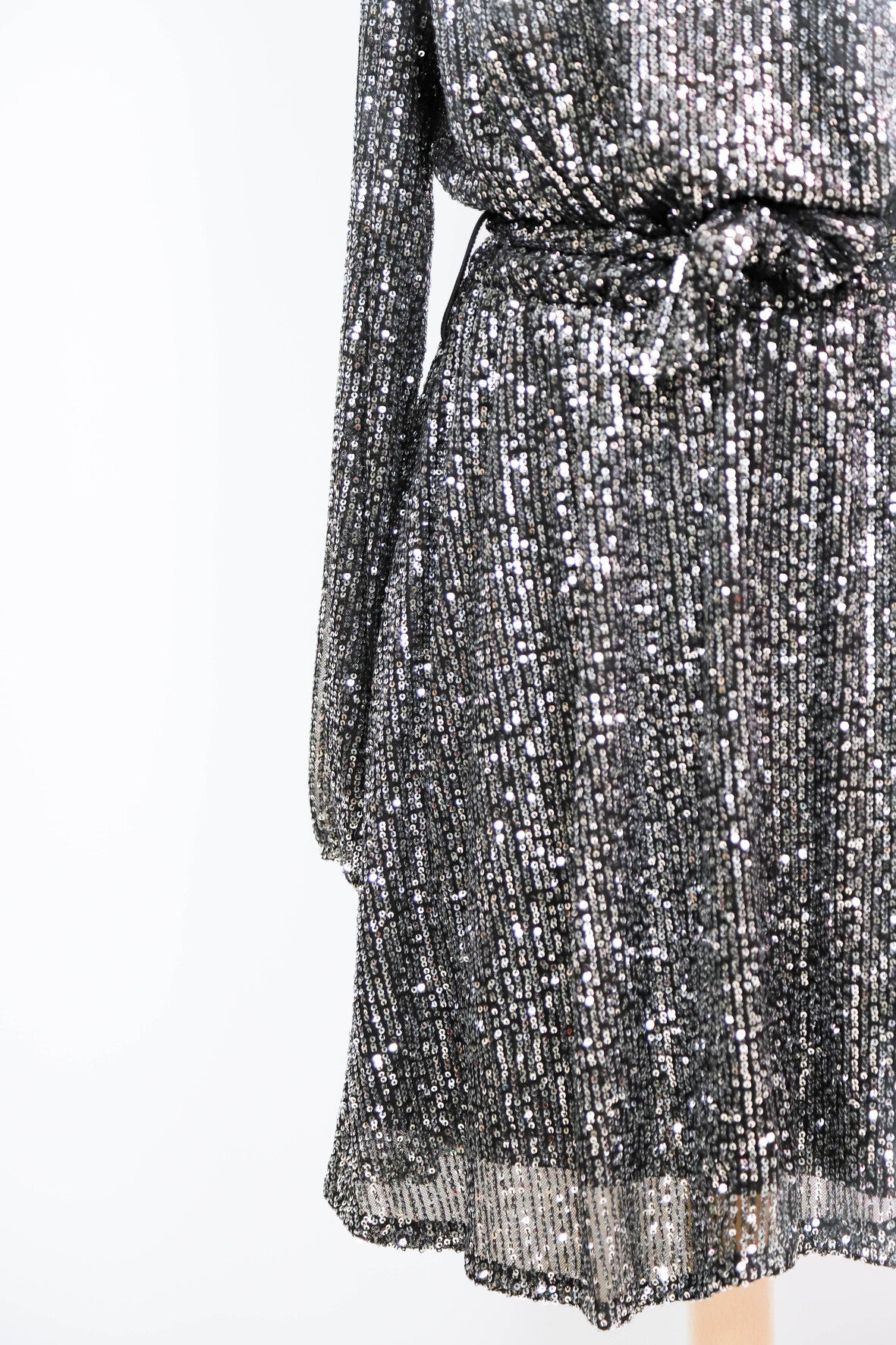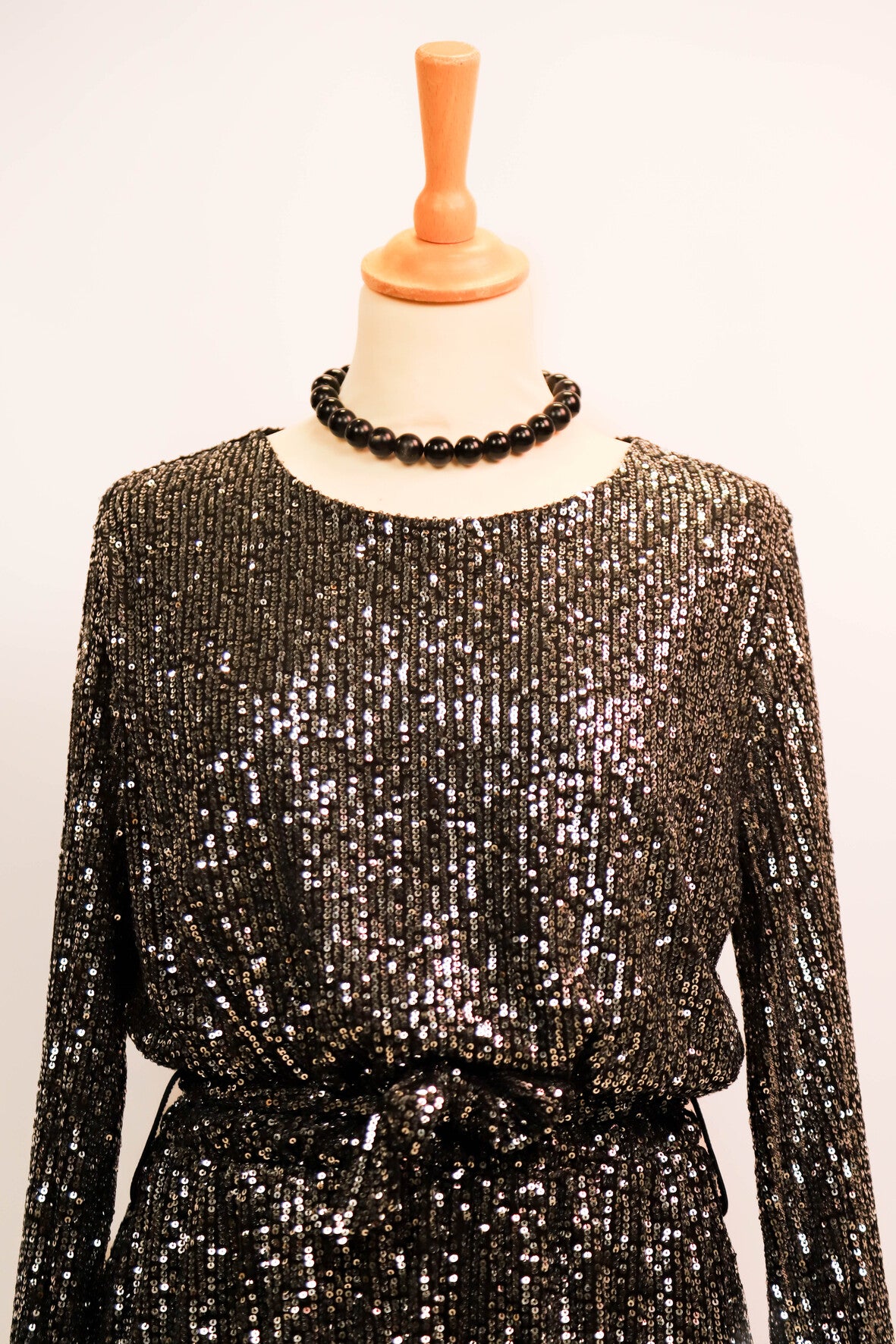 Robe à sequins, taille élastique et ceinture à nouer. Doublure sauf sur les manches