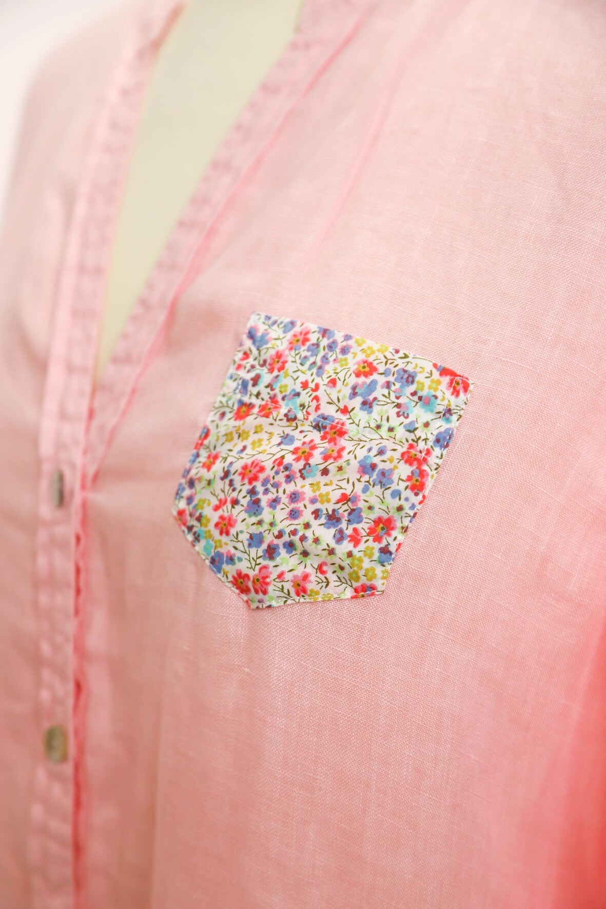 DESCRIPTIF | Robe chemise en lin avec poches. Poche poitrine en libertie sur le côté gauche |