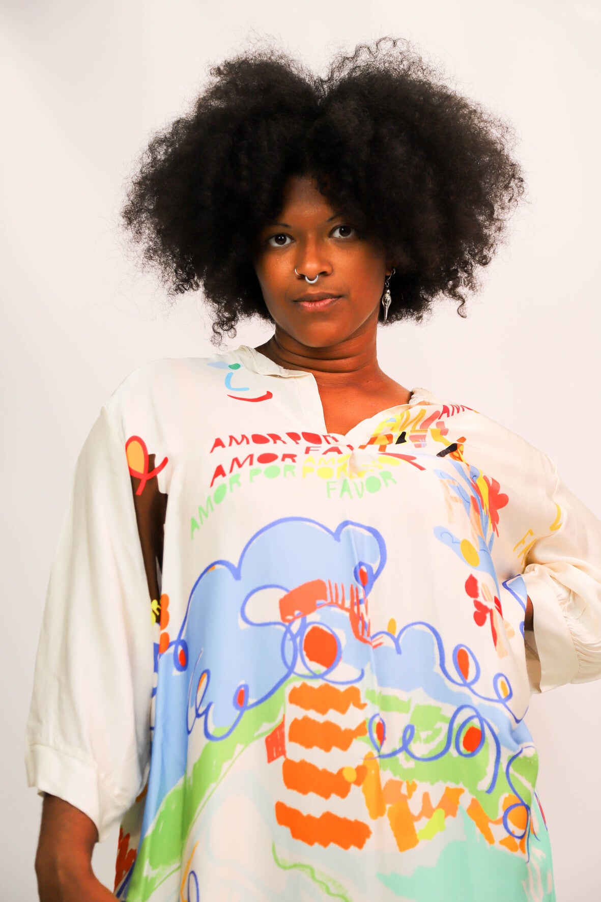 Robe fluide effet satinée. Manches chauve souris, col V. Illustrations multicolore