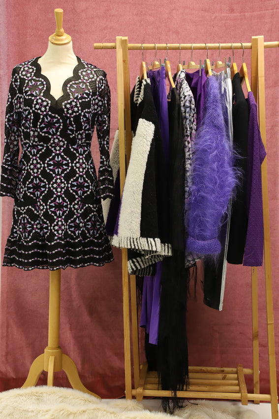 - Robe noire à manches longues, guipure avec motifs fleurs bleues et violettes