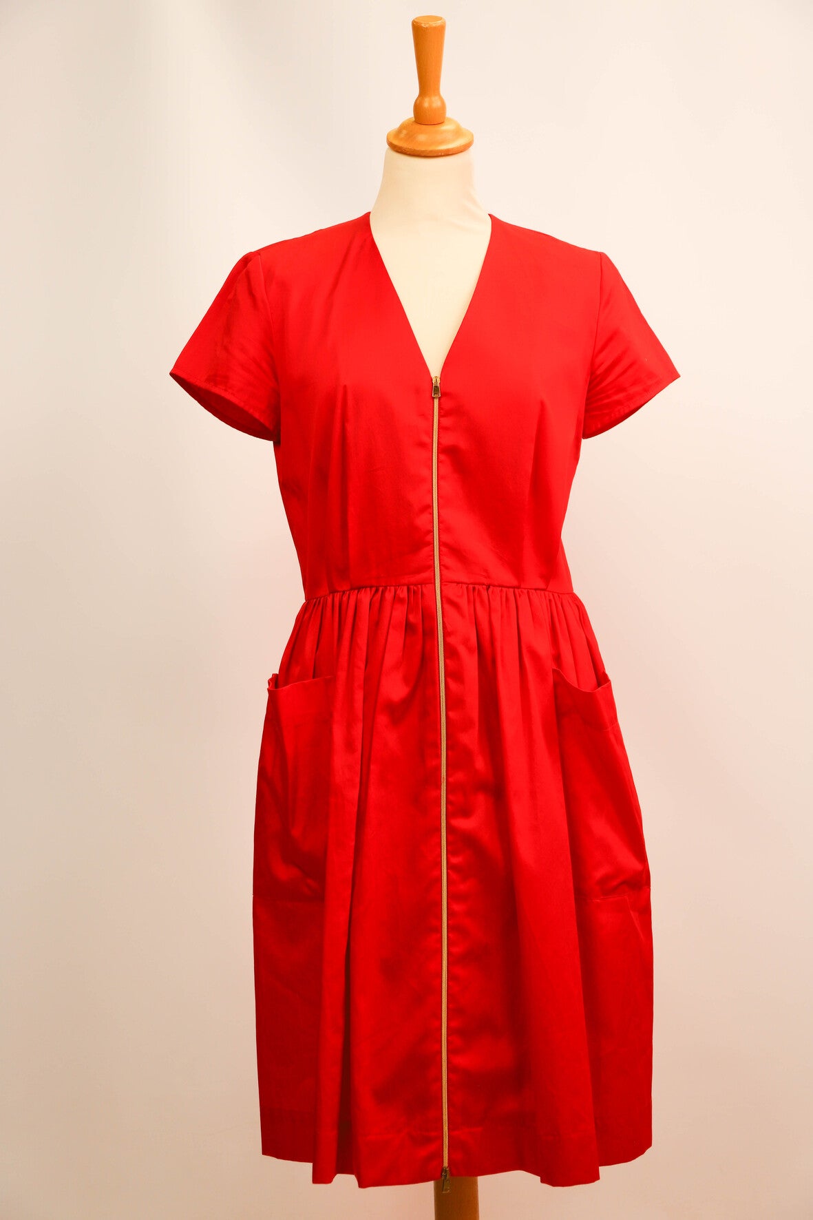 DESCRIPTIF | Robe manches courtes avec col en V. Fermeture éclair sur tout la longueur. Deux grandes poches de chaque côtés |